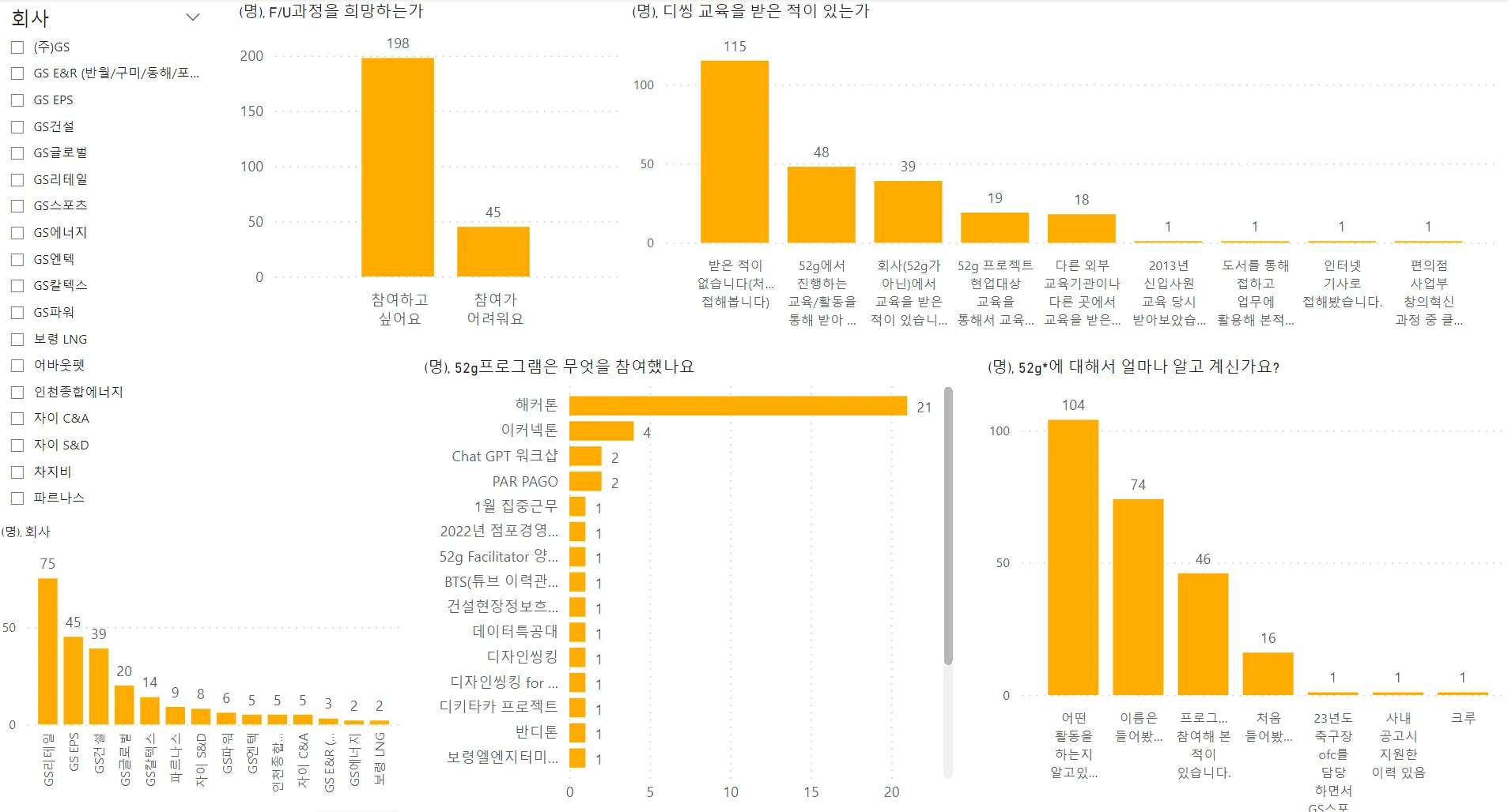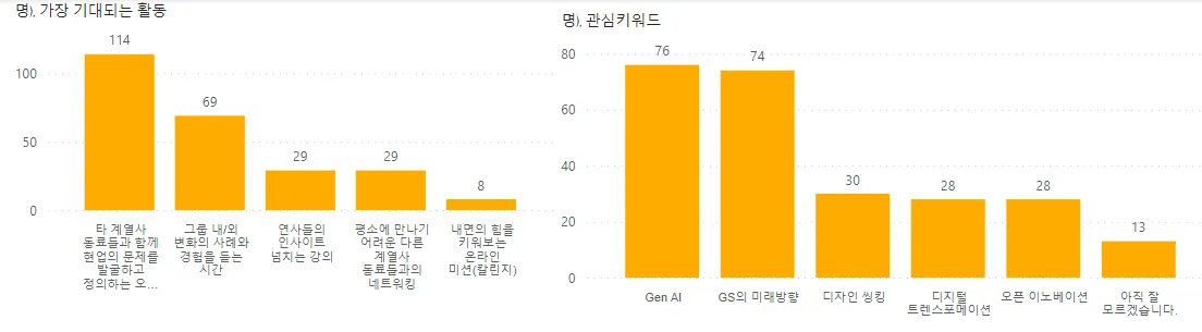 카탈리스트 과정 중 가장 기대가 되는 것으로는 타계열사 동료들과 네트워킹과 함께 현업의 문제에 대해 이야기 하는 것에 많은 기대를 하고 있었으며, 관심 키워드로는 GenAI, GS의 미래방향을 키워드로 뽑았네요.