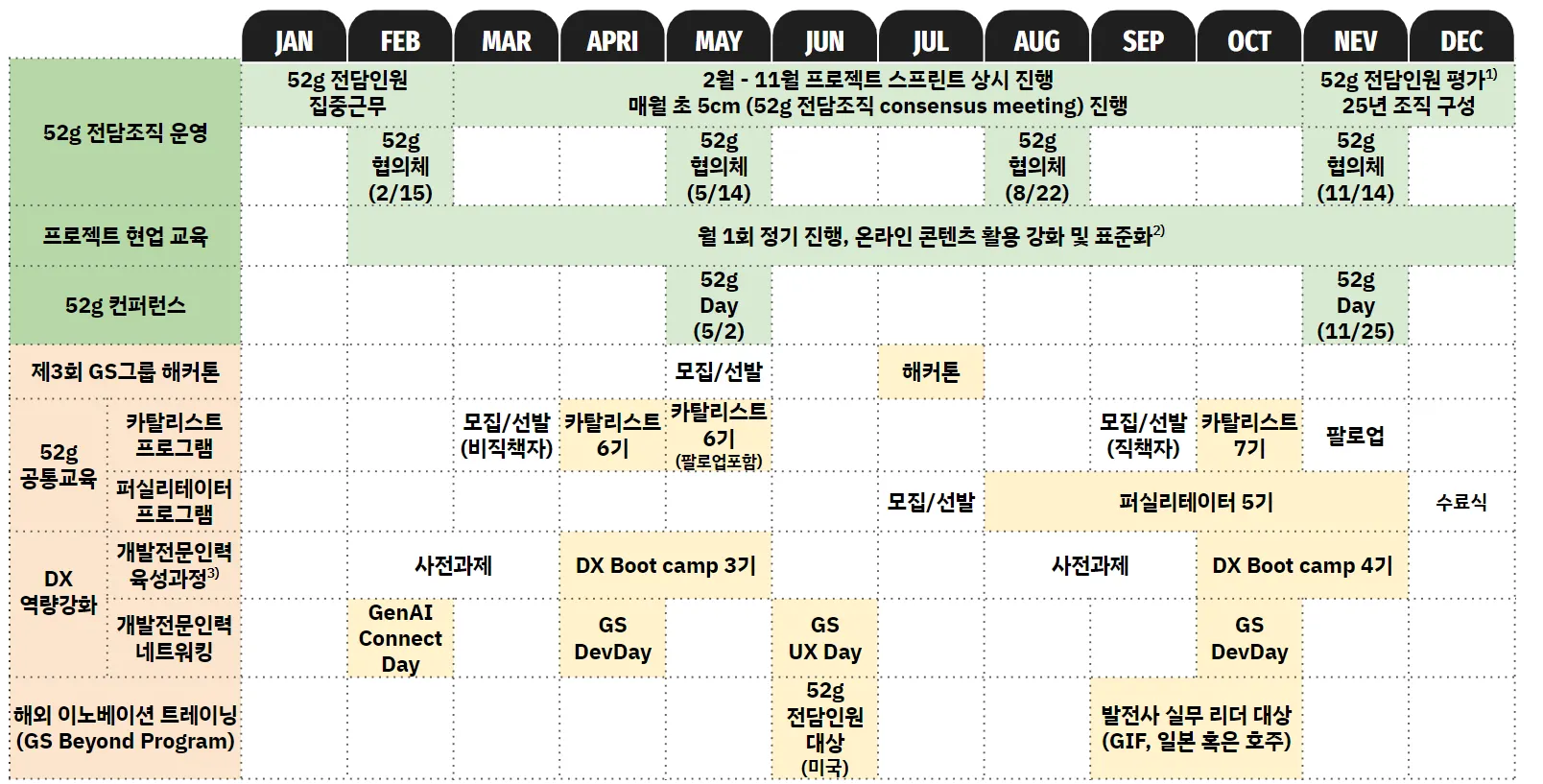그 외에도 Class 52, 슬기로운 52g 생활(성장세션), 찾아가는 러닝랩, 전담인원 집중근무 프로그램 등에 참여하여 52g crew와 현업분들에게 성장과 배움의 기회를 도움을 드리고, 같이 성장하기 위하여 노력하고 있습니다