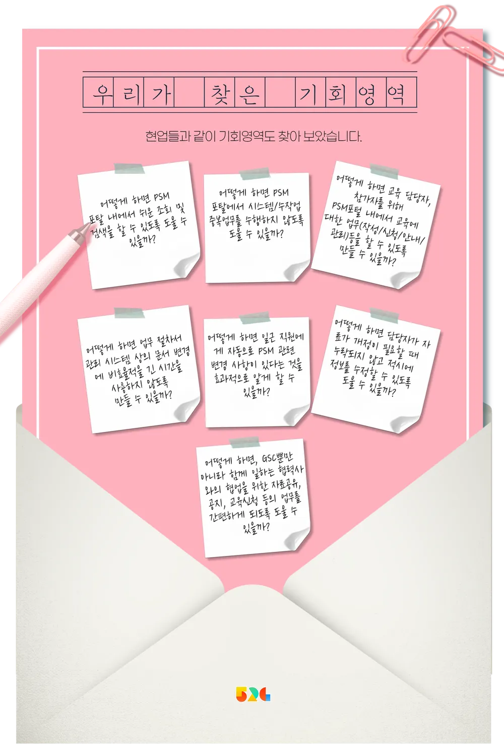 목적과 결과 : PI를 위해 TF에서 두 달 동안 리서치(인터뷰, 벤치마킹 등)한 내용들을 정리하고 공유하여 서로의 생각을 통합하는 시간을 갖음으로써, PSM에 대한 업무와 시스템 상의 어려움을 찾아, PSM포털에 반영해야 할 기회영역을 도출했습니다.