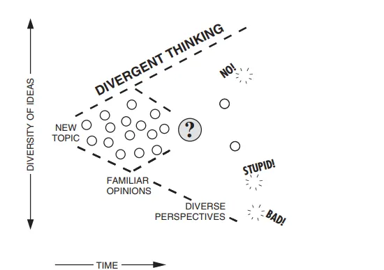 하지만 단 한번의 확산과 수렴으로 제대로 된 의사결정을 할 수 있을까요? 최종 의사결정까지 가기 위해서는 아래와 같이 확산과 수렴이 수시로 일어나야합니다. 그리고 반복된 확산과 수렴 과정에서는 어이없는 아이디어, 멍청한 아이디어라고 생각될 수 있는 아이디어들이 같이 혼재되어 있습니다.