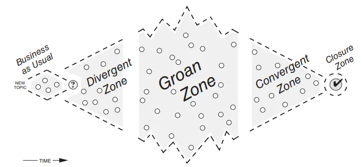 사람들은 확산과 수렴이 반복되어 최종 의사결정으로 가는 과정에서 ‘시간을 낭비하고 있다’, ‘우리는 발전이 없다’ 느끼기도 합니다. 그리고 서로 으르릉 거리며 자신의 의견을 고집하는 갈등의 구간(Groan Zone)을 맞이하게 되며 의견이 좁혀지지 않는 것을 경험하기도 합니다. 이럴 때는 고객의 니즈와 어려움으로 돌아가 데이터 기반으로 의사결정을 하려는 노력을 해야 하죠.