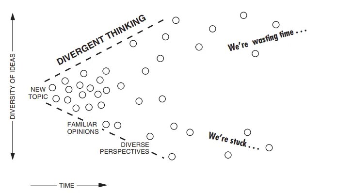소설에 기승전결이 있듯이, 논의에도 흐름이 있습니다. 큰 의사결정 속에 우리는 수많은 확산과 수렴 절차를 거칩니다. 우리가 자주 마주하는 일반적인 회의의 모습은 아래와 같습니다. 주제에 대해서 각자 의견이 제시되고, 수렴되지 않고 각자의 방향으로 흘러가죠.