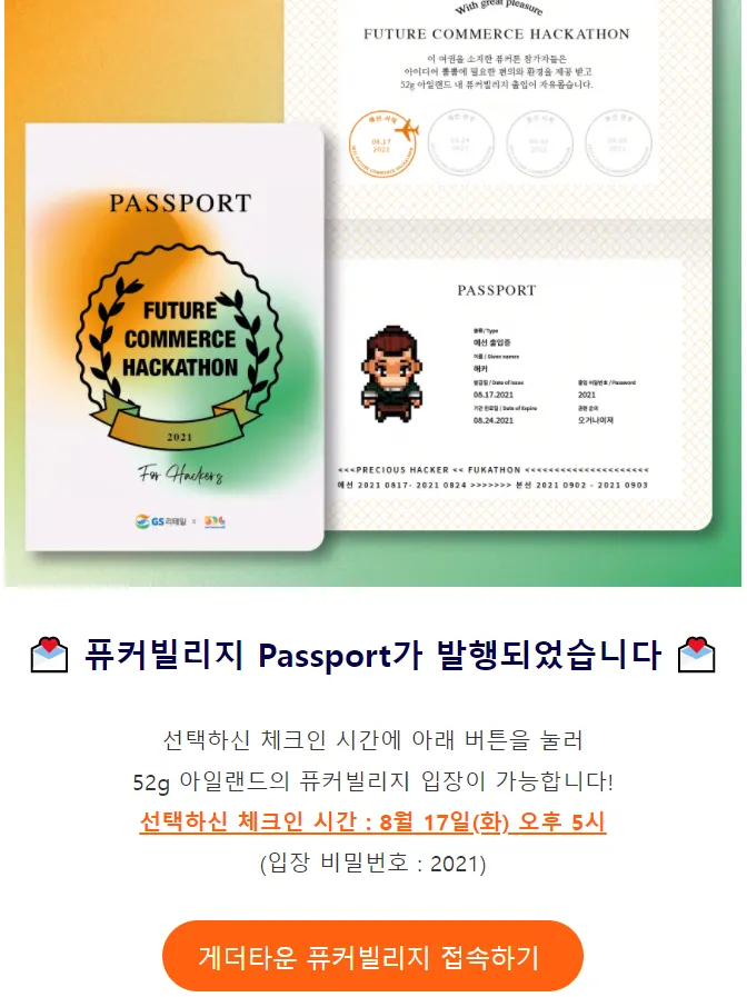을 입혔는데요. 게더타운에 52g가 활동하는 섬 ‘52g Island’를 만들고, 그 안에 퓨커톤 참가자들을 위한 공간 ‘퓨커빌리지’를 마련했습니다. 참가자들은 퓨커빌리지 입국 비자가 발급된 여권을 통해 퓨커빌리지로 입장하는거죠!!
