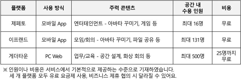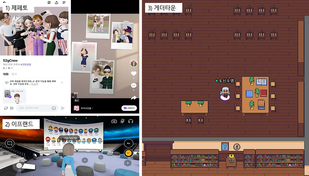 아바타를 중심으로 놀이에 초점을 맞춘 제페토(좌측 위), 컨퍼런스 기능이 좋은 이프랜드(좌측 아래), 업무/교육과 관련된 기능을 제공하는 게더타운(우측)