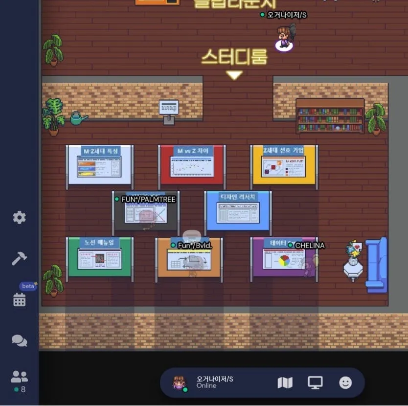 배정된 공간을 팀 원들과 직접 꾸미고, 꾸민 공간에서 팀 별로 협업을 진행했는데요. 팀 공간 안으로 들어가면 공간 내에 있는 팀 원들끼리만 화상 연결이 되기 때문에 다른 팀이 아이디어를 엿들을 걱정 없이 맘껏 논의할 수 있어요.
