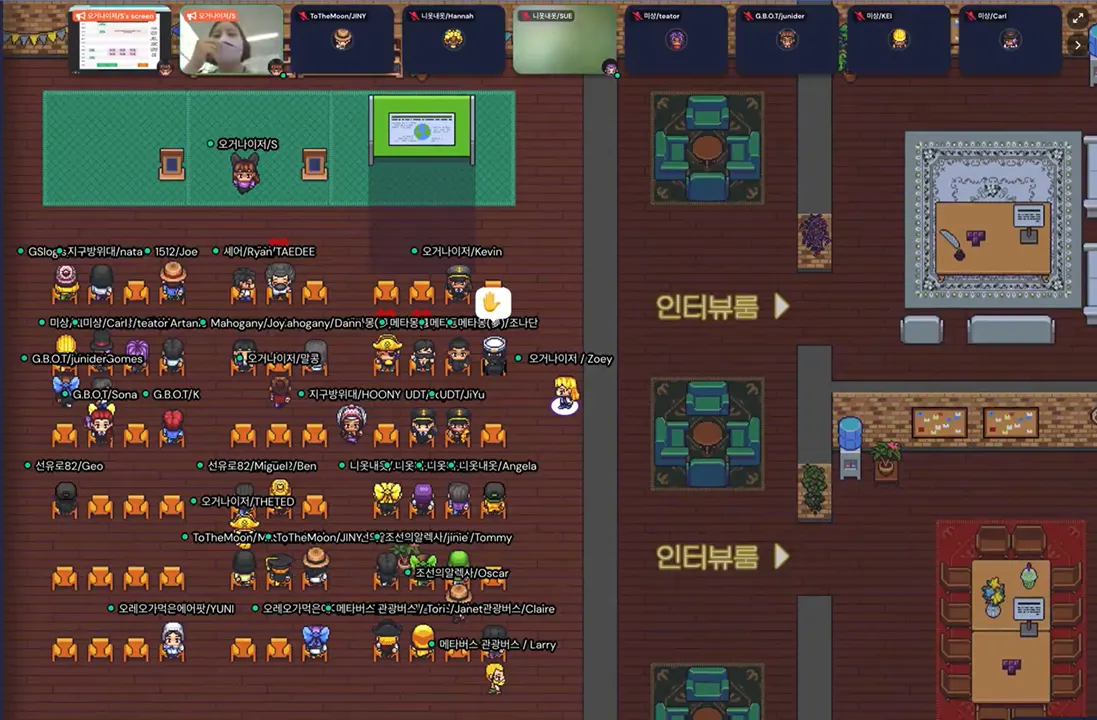 아바타가 모여서 듣는 OT는 귀엽고 재밌지만, 줌(Zoom)에서 처럼 호스트의 화면 공유 권한, 음소거 관리가 매끄럽진 않아요. 다수를 대상으로 한 발표의 경우 체크인 단계에서 미리 음소거 설정을 하도록 안내하고, 질문은 채팅으로 하도록 하면 여기저기서 지방방송이 울리는 걸 방지할 수 있답니다!