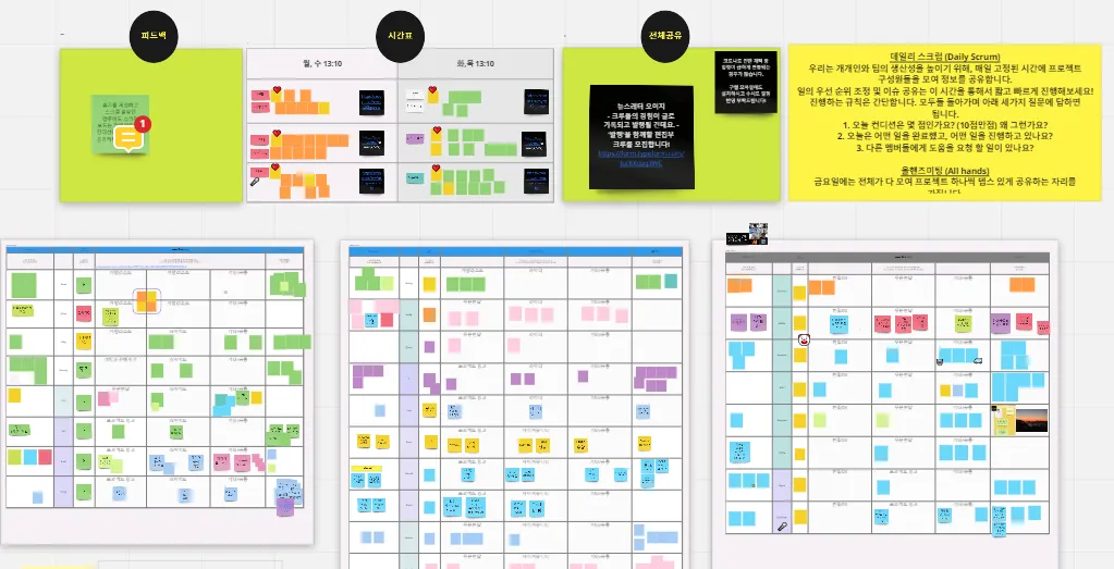 크루 간 업무현황은 매일 1시 스크럼 회의에서 알 수 있습니다.
