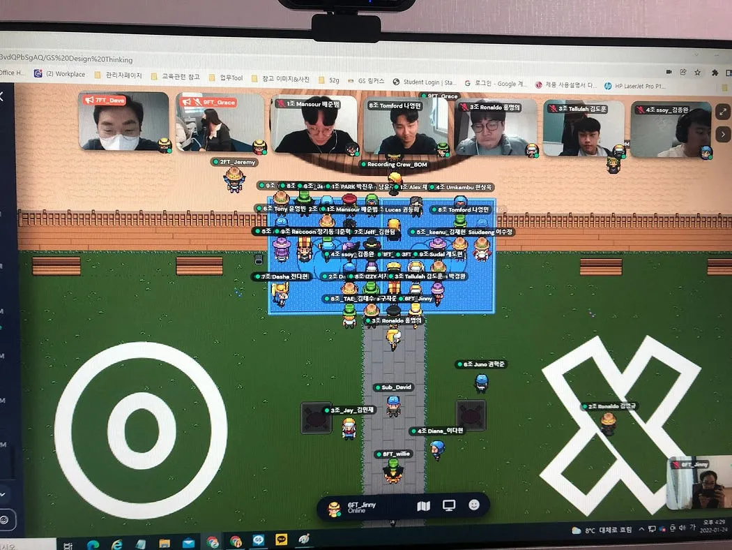 메타버스로 진행된 신입사원 디자인씽킹 워크샵 장면입니다. OX 퀴즈를 하고 있습니다.