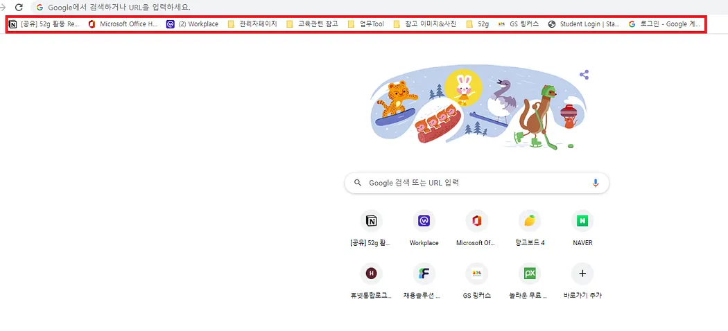 크롬창으로 구글사이트에 접속하니 회사PC에 즐겨찾기 해놓은 사이트가 동기화되어 평소에 접속했던 모든 사이트에 쉽게 접속할 수 있었습니다.