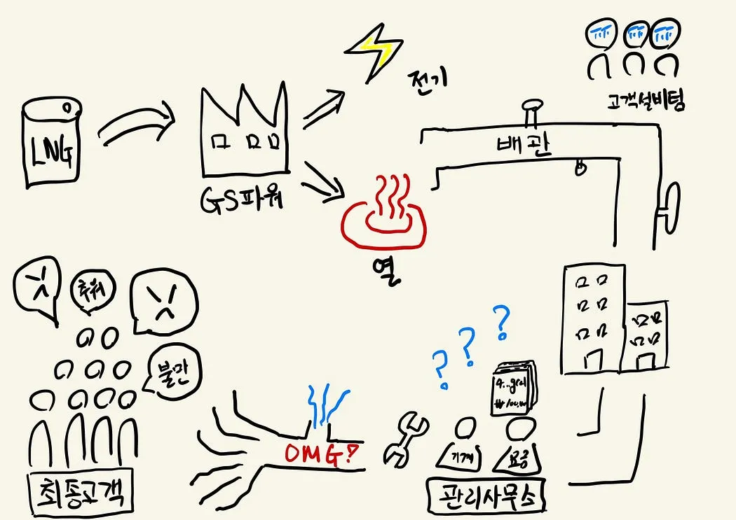 GS파워의 최종 열 사용자는 아파트/오피스텔 입주민(왼쪽 하단)인데요. 저희의 상품인 급탕/난방/냉방 품질을 책임지는 중요한 역할을 ‘관리사무소 직원(오른쪽하단)’분들이 합니다. 관리사무소 직원 분들이 실질적으로 GS파워의 1차 고객이며 (GS파워 소속이 아님) 이분들의 서비스/설비 역량을 키워 최종고객의 만족도를 높일 수 있도록 GS파워가 할 수 있는 방안들을 고민했죠. (설비 고장, 유지 보수, 열요금 책정 등등)