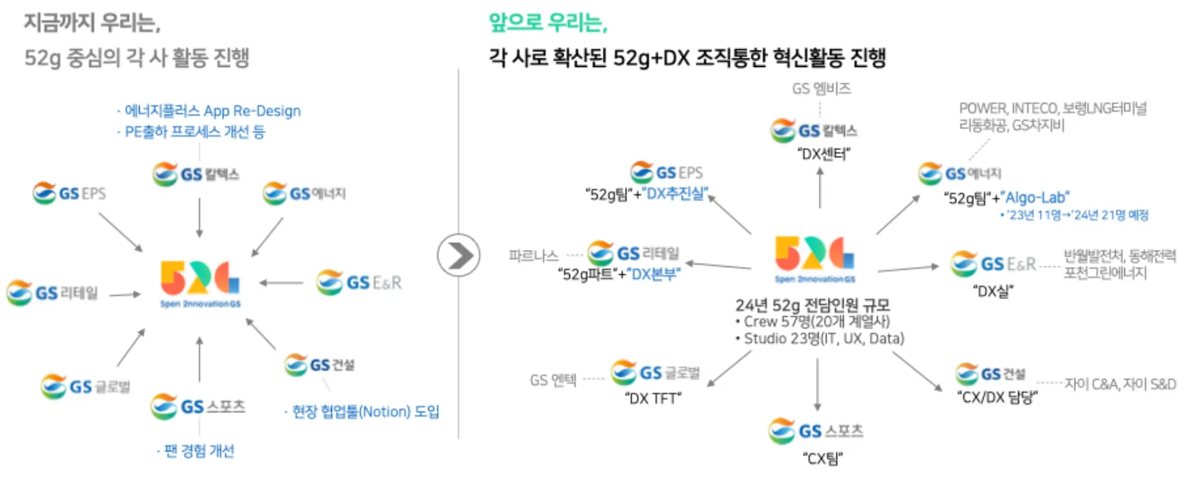 52g is an open innovation community, creating a sustainable growth for GS by adapting dynamically to change. Any of us can bring problems to light and work together to create value.