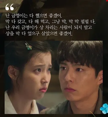 난 금명이는 다 했으면 좋겠어. 막 다 갖고, 다 해 먹고, 그냥 막, 막 막 펄펄 다, 난 우리 금명이가 상 차리는 사람이 되지 말고 상을 막 다 엎으구 살았으면 좋겠어.