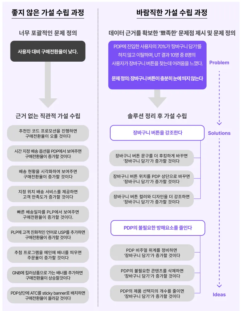 가설이 섹시해야 합니다. 이게 무슨 이야기인가 하면, 가설이 섹시하려면 좋은 문제를 선정해야 한다는 것인데요. 너무 포괄적인 문제 정의, 근거 없는 직관적 가설보다는 데이터 근거를 확보한 ‘뽀족한’ 문제점을 가진 문제를 정의할 수 있어야 한다는 것이지요.
